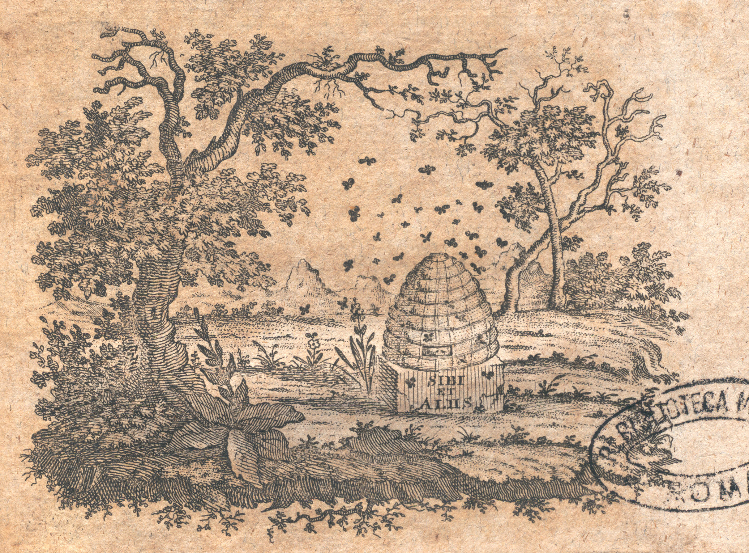 Su prato fiorito, tra alberi api volano intorno ad arnia alla cui base è inciso il motto.