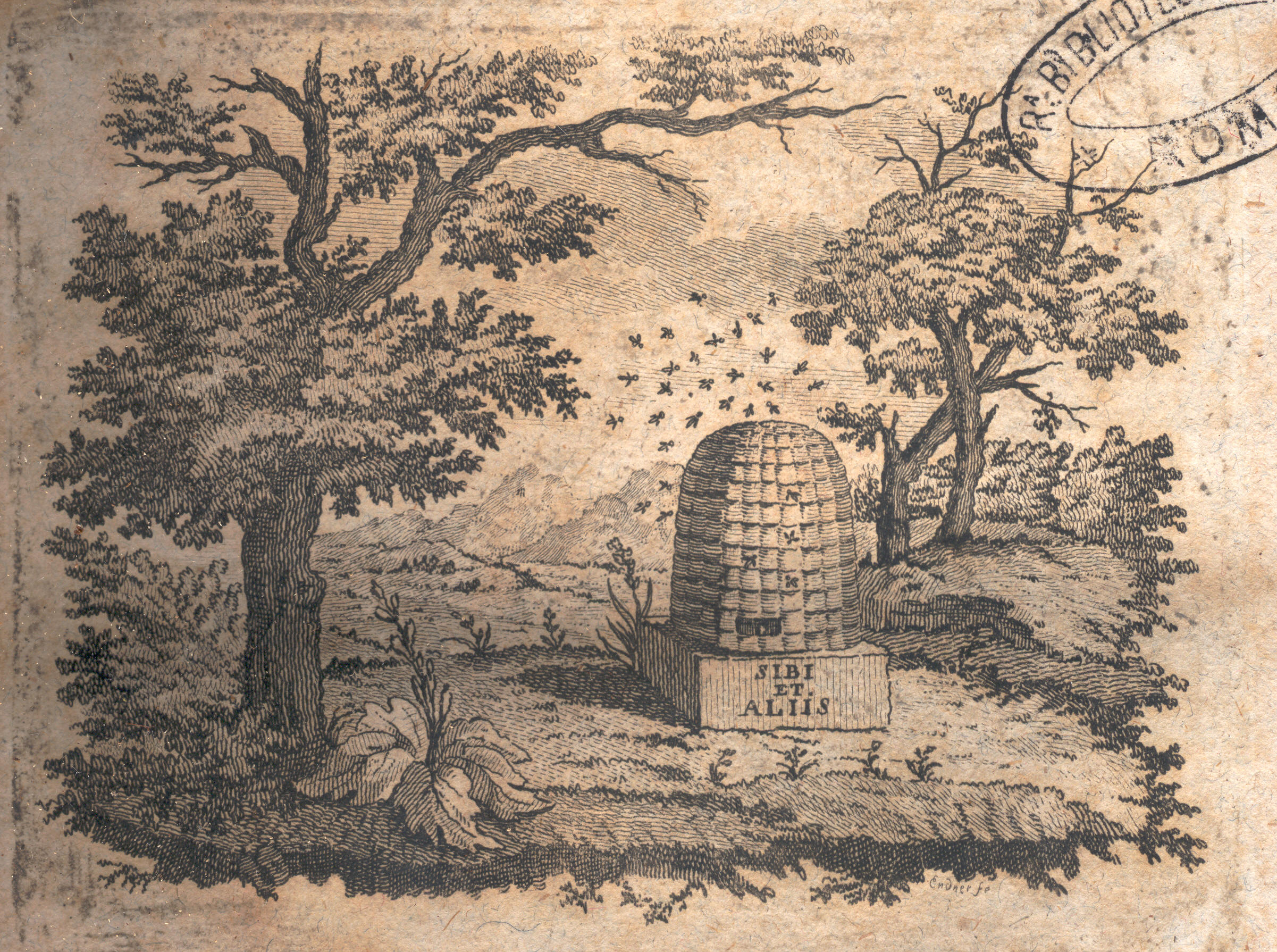 Su prato fiorito, tra alberi api volano intorno ad arnia alla cui base è inciso il motto.