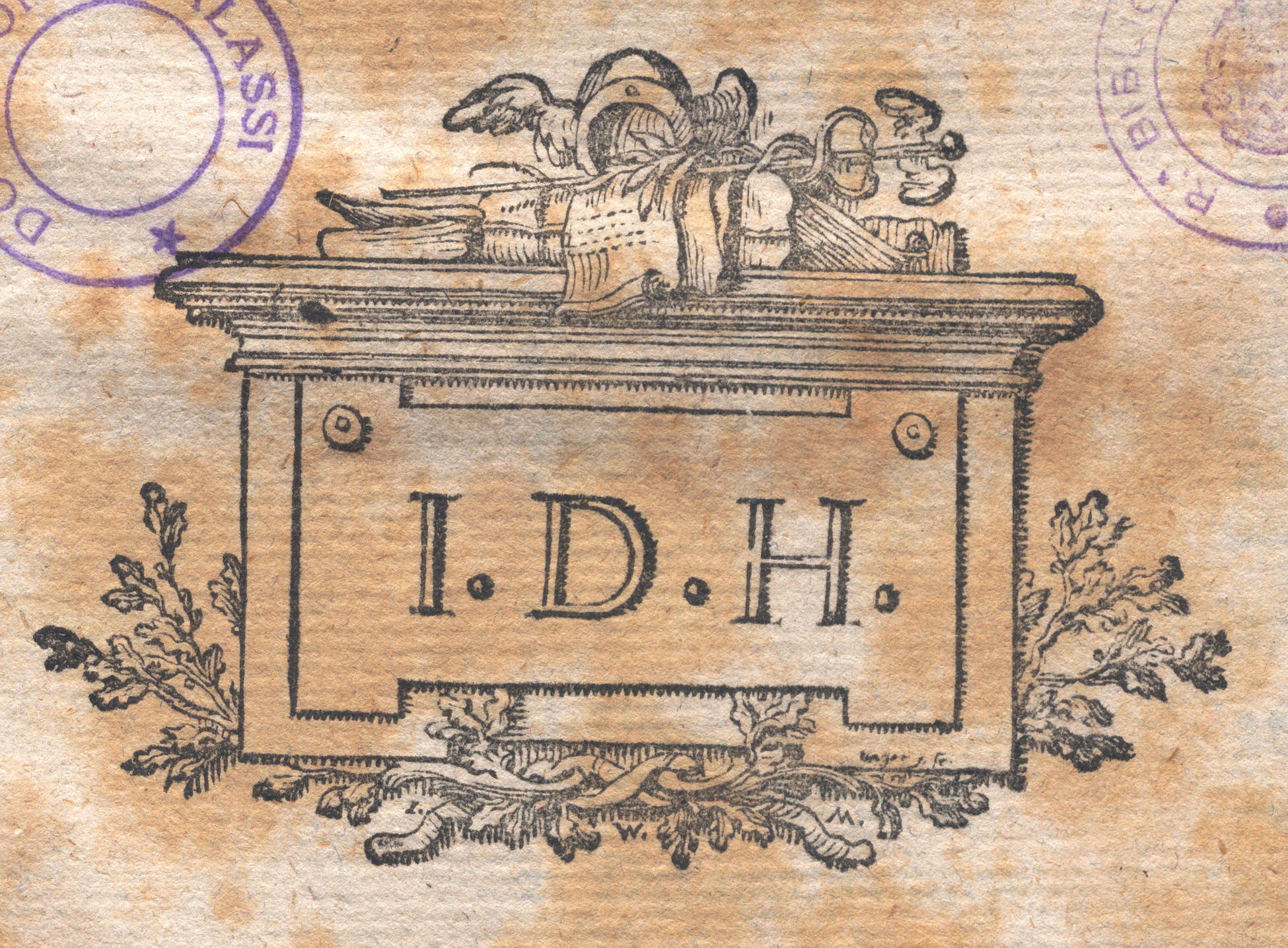 Poggiati su altare elmo alato, caduceo e libri. In grande evidenza nella parte frontale le iniziali del tipogr.