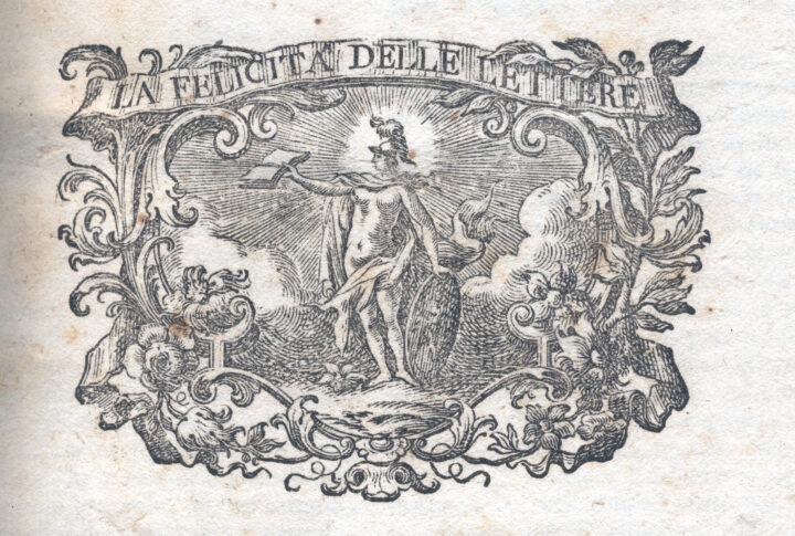 Minerva al centro di raggi luminosi sostiene uno scudo con la sinistra e un libro con la destra.