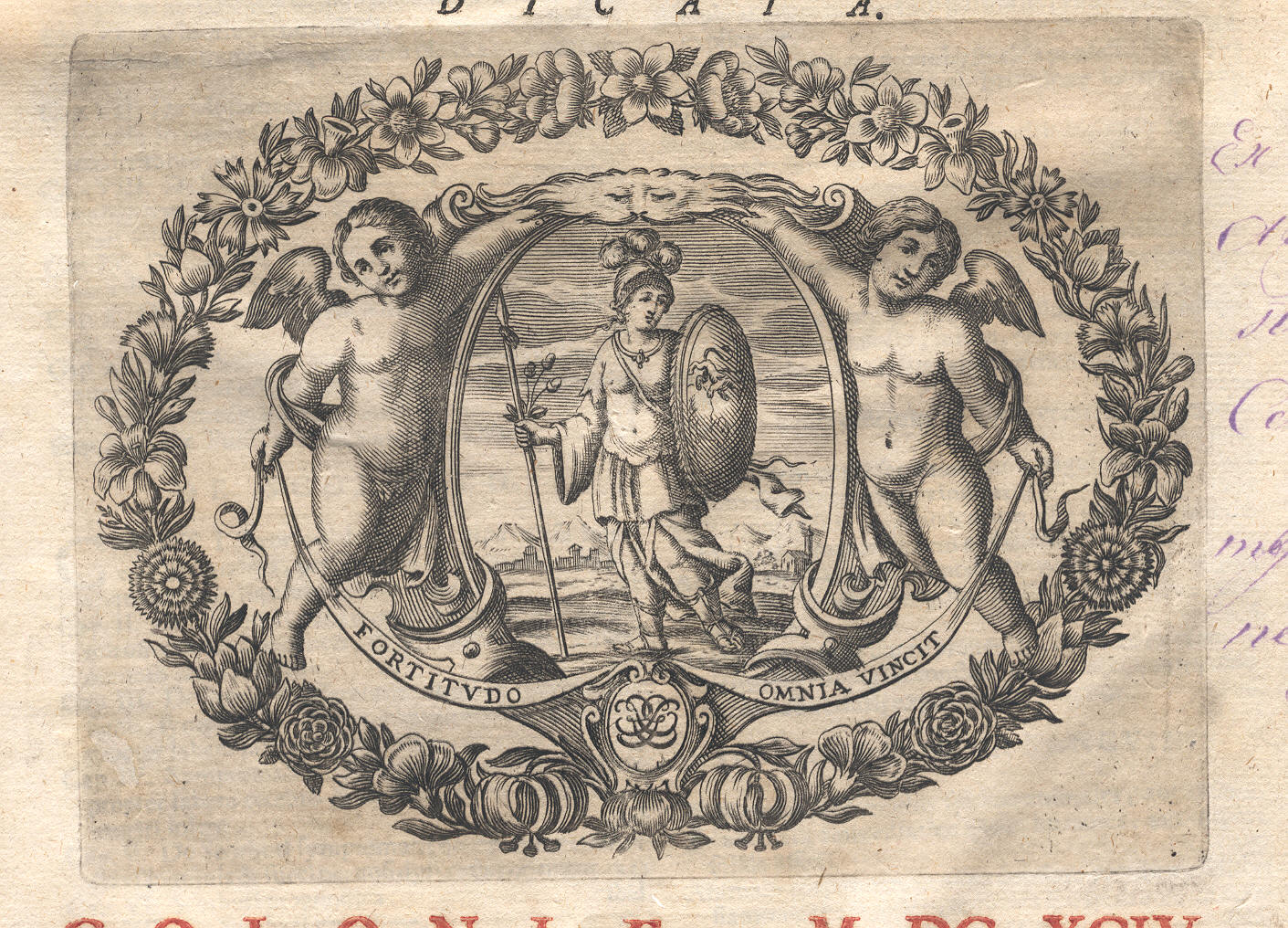 Minerva affiancata da putti alati. In basso iniziali SG