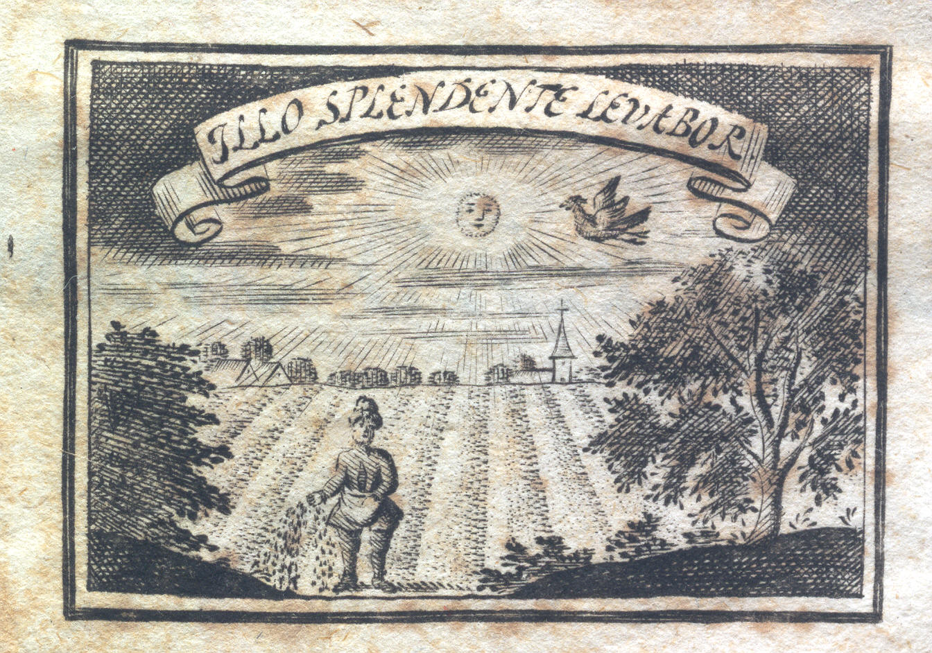 Sole radiante su campo arato nei cui solchi un seminatore getta semi.
