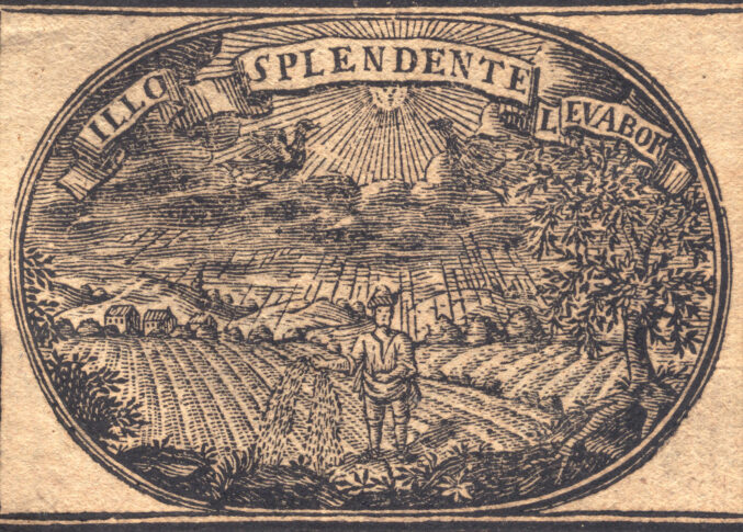 Sole radiante su campo arato nei cui solchi un seminatore getta semi.