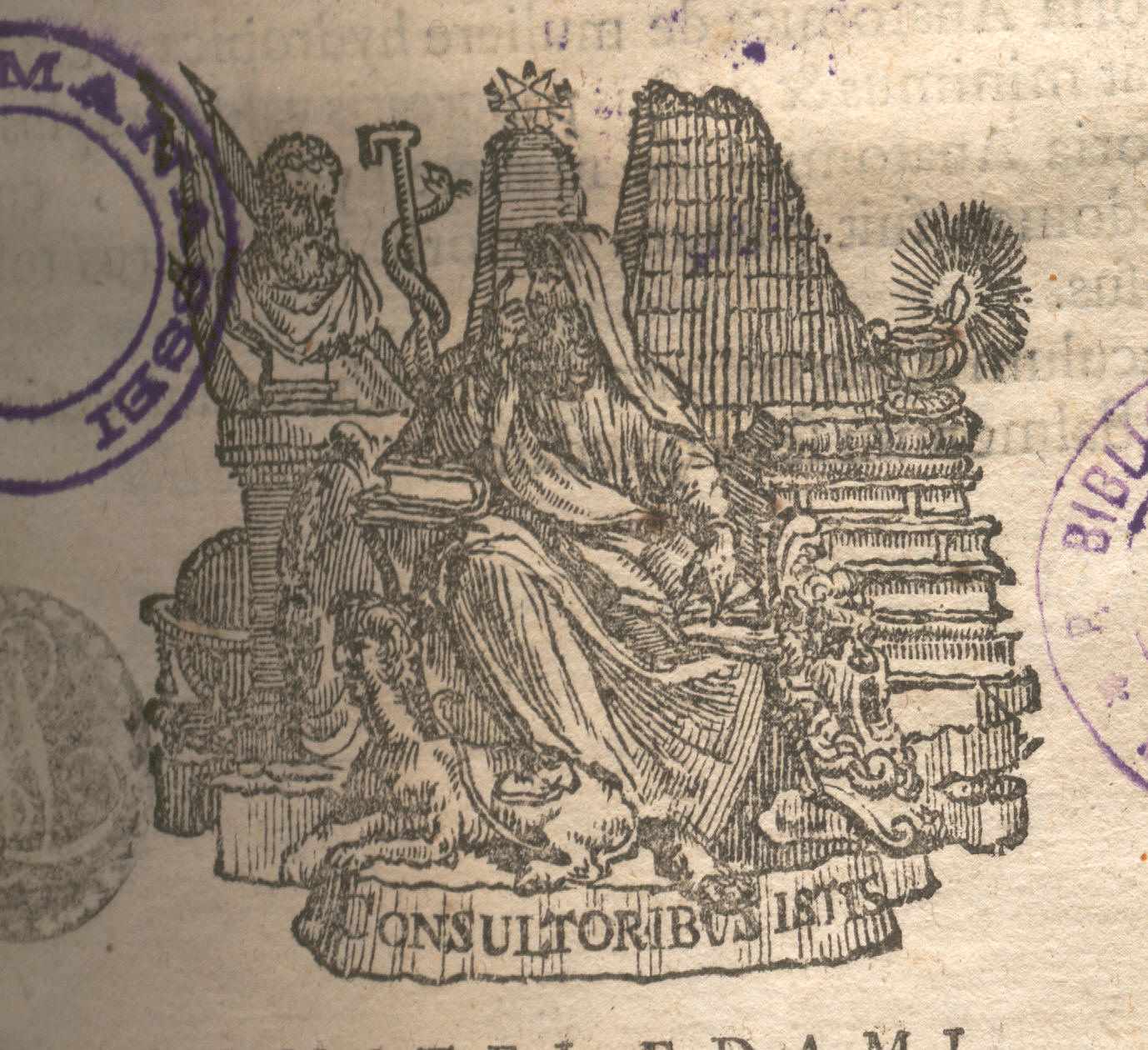 Vecchio seduto , affiancato da libri su cui splende un lume e dal busto di Esculapio poggia un piede su sfinge