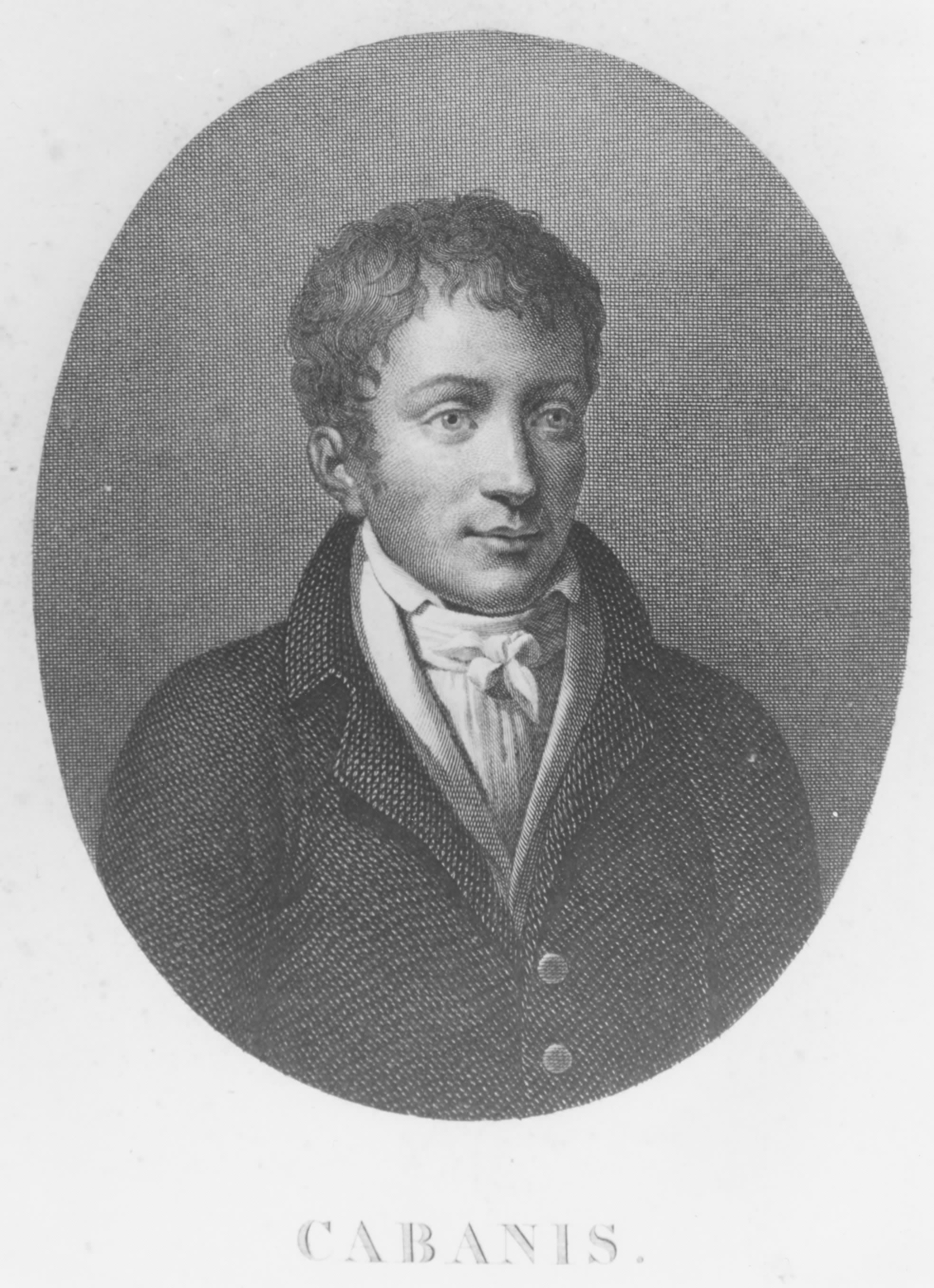 Nato a Conac nel 1707 da Jean Baptiste, uomo freddo ed eccessivamente severo, non mostra nella prima giovinezza interesse per gli studi né capacità di impegnarsi fino a che il padre lo invia a Parigi lasciandolo libero di gestire la sua vita sulla quale vigileranno alcuni buoni amici di famiglia primo tra tutti il Turgot, allora ministro delle finanze. Da questo momento il quattordicenne Cabanis si dedicherà con passione a studi di fisica e di filosofia fino al 1773, quando si recherà in Polonia come segretario di un nobile polacco. Rientrato a Parigi, diviene amico del poeta Roucher e decide di intraprendere la carriera letteraria. Non ottiene alcun successo e, per sopravvivere, deve ricorrere all’aiuto economico dal padre che lo esorta a scegliersi una professione. Cabanis decide di studiare medicina e si formerà, a Parigi, sotto la guida del Dubreil al fianco del quale praticherà con successo la professione per circa sei anni. Trasferitosi ad Auteil conosce Madame Helvetius che apprezza le sue cure e lo introduce nei salotti più importanti dell’epoca, dove Cabanis conosce il Mirabeau del cui entourage entra a far parte divenendone amico e medico di fiducia. Alla morte del Mirabeau il Cabanis si ritira a vita privata ma nell’anno III della rivoluzione francese gli viene affidato l’incarico di organizzare le scuole centrali di me dicina, viene poi nominato professore di igiene e, infine, gli viene conferita la cattedra di medicina clinica a l’Ecole de Paris. Le fatiche e l’ ansia legate ai molteplici incarichi gli causano un primo attacco di apoplessia nella primavera del 1807 cui ne seguirà uno mortale il 5 maggio 1808 mentre passeggia per le vie della cittadina di Rueil dove si era recato a trascorrere l’inverno. Delle sue numerose opere, scritte quasi tutte sotto forma di memorie ricordiamo: Journal de la maladie et de la mort de Mirabeau; Observations sur les hopitaux. Parigi, 1789; Rapport au Conseil des Cinqcents sur l’organization des écoles de medicine, seance du 29 brumaire an VII; Traité du physiqe et du moral de l’homme. Parigi, 1803; e Observations sur les affections catarrhales en général et particulièrement sur celles connues sous le nom de rhume de cerveau et rhume de poitrine, Parigi 1807.