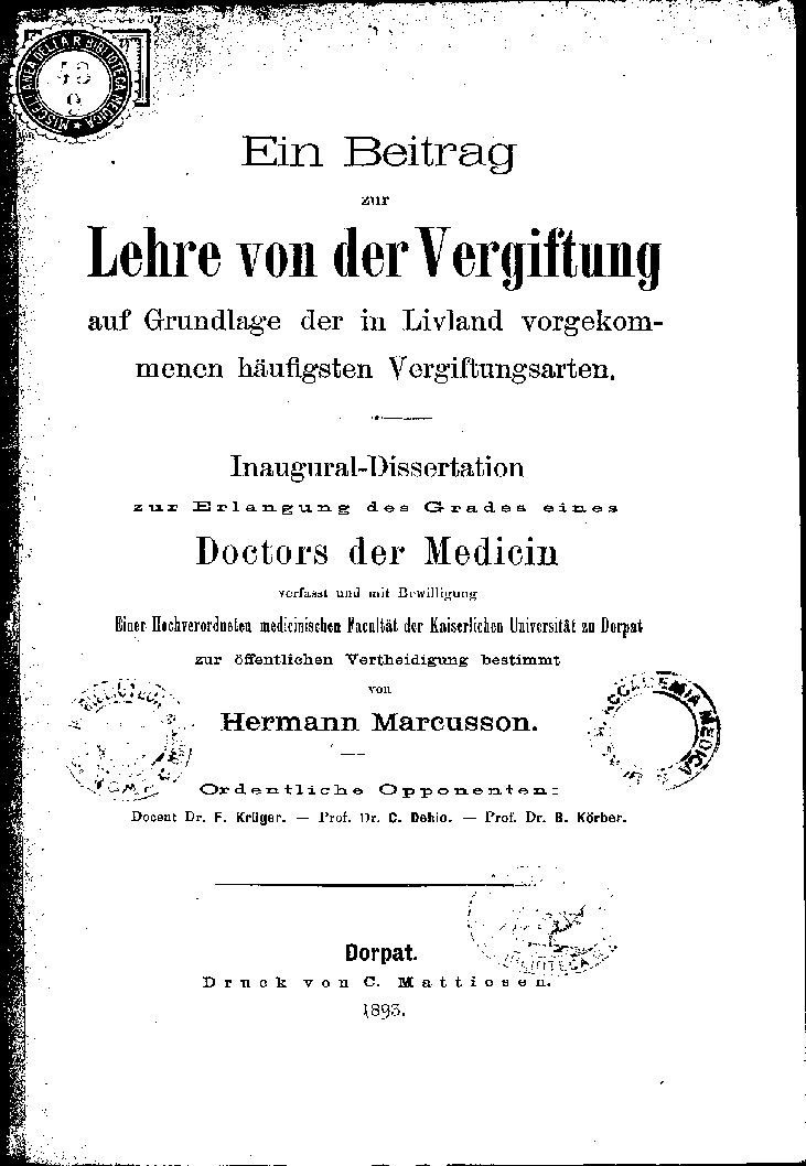 Einer Hochverordneten medicinischen Facultät der Kaiserlichen Universität zu Dorpat
