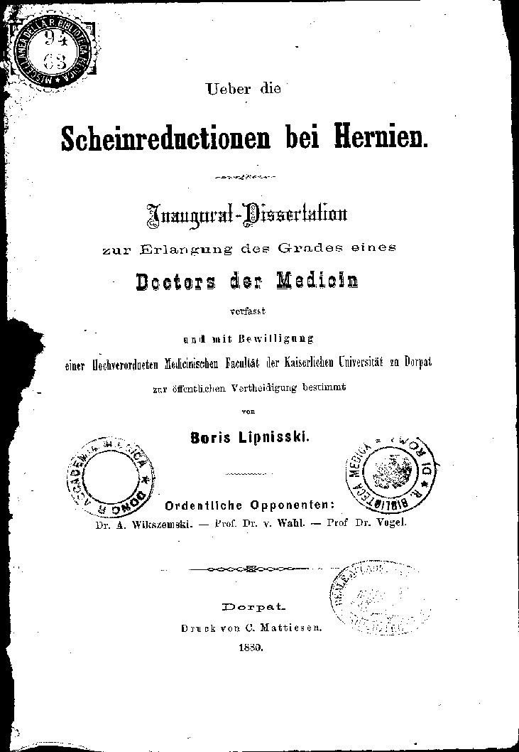 einer Hochverordneten Medicinischen Facultät der Kaiserlichen Universität zu Dorpat
