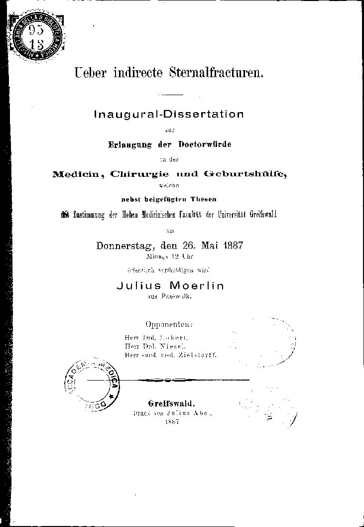 mit Zustimmung der Hohen Medicinischen Facultät der Universität Greifswald