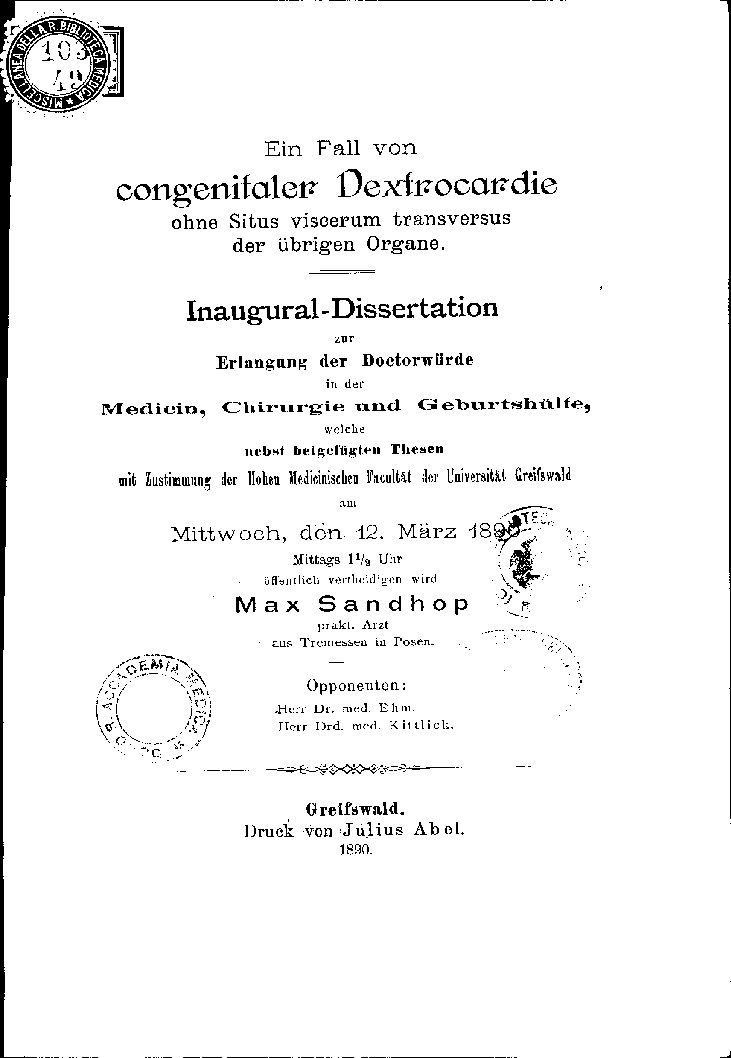mit Zustimmung der Hohen Medicinischen Facultät der Universität Greifswald