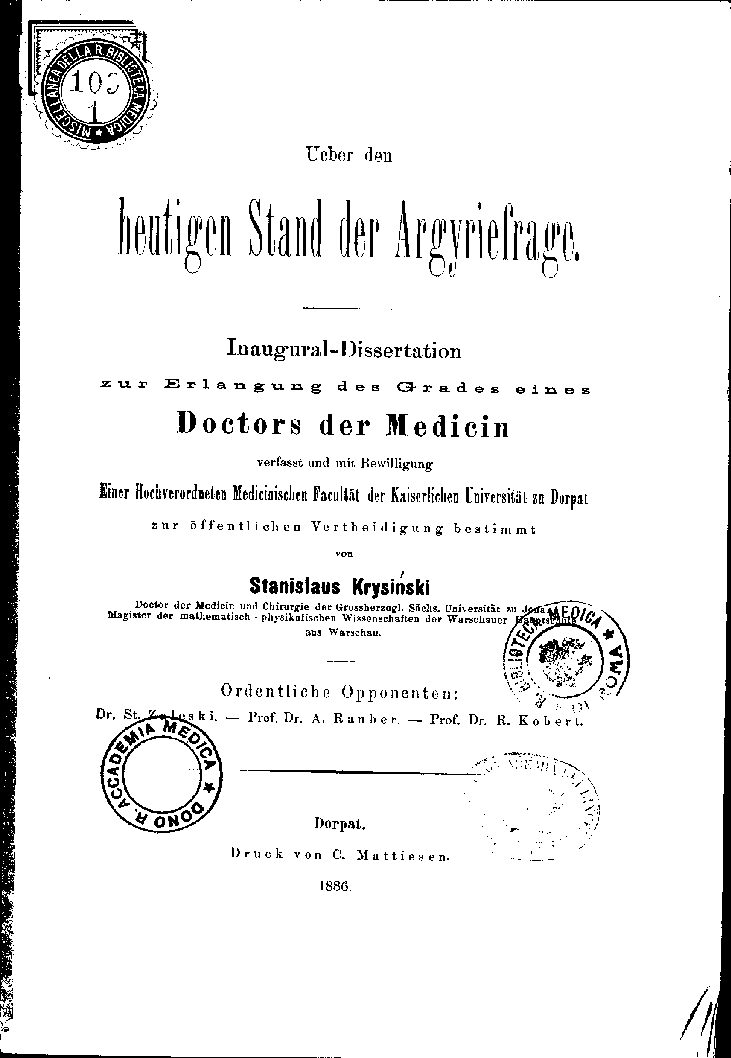 Einer Hochverordneten Medicinischen Fcultät der Kaiserlichen Universität zu Dorpat
