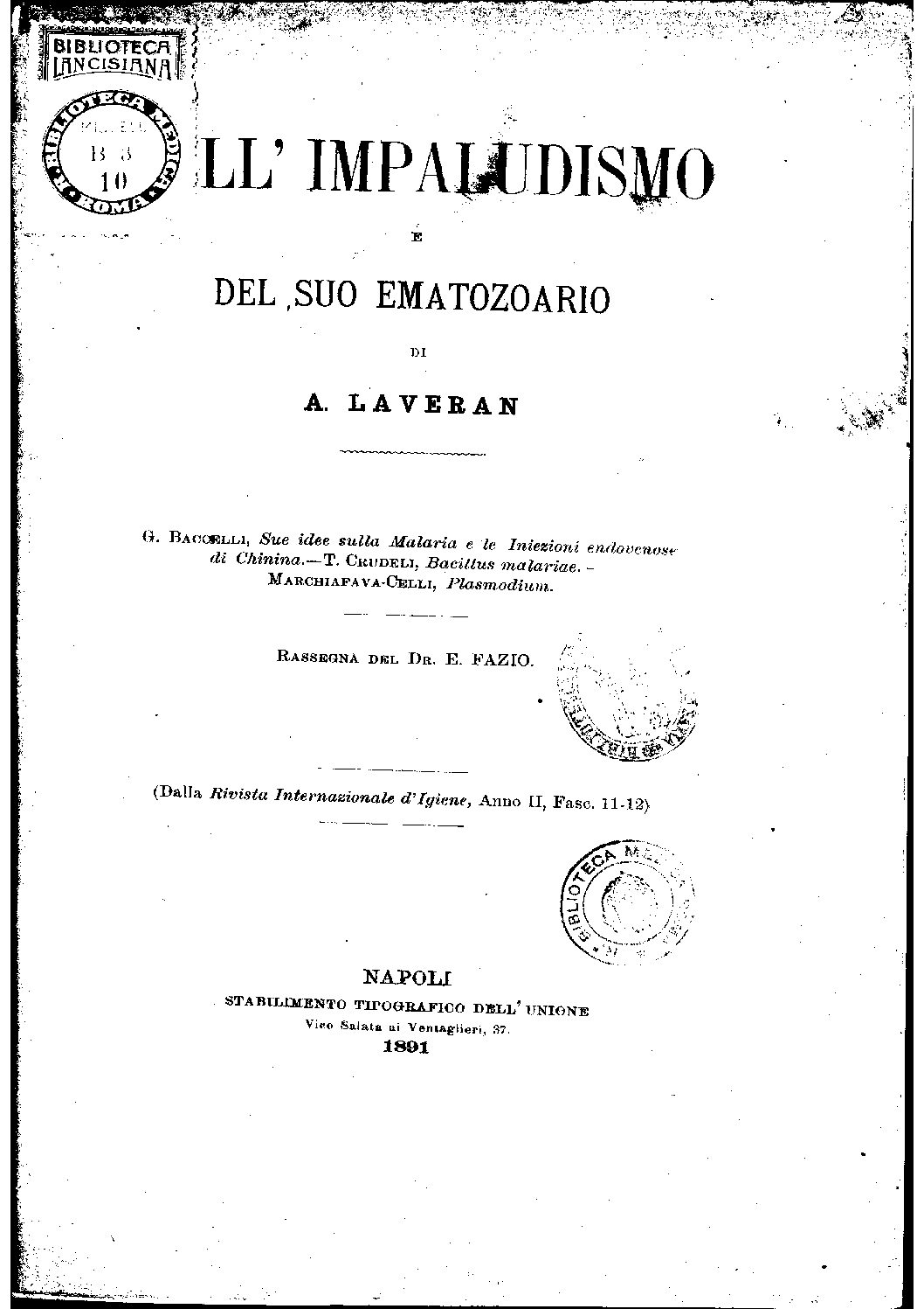 di Chinina.-T. CRUDELI, Bacillus malariae.-