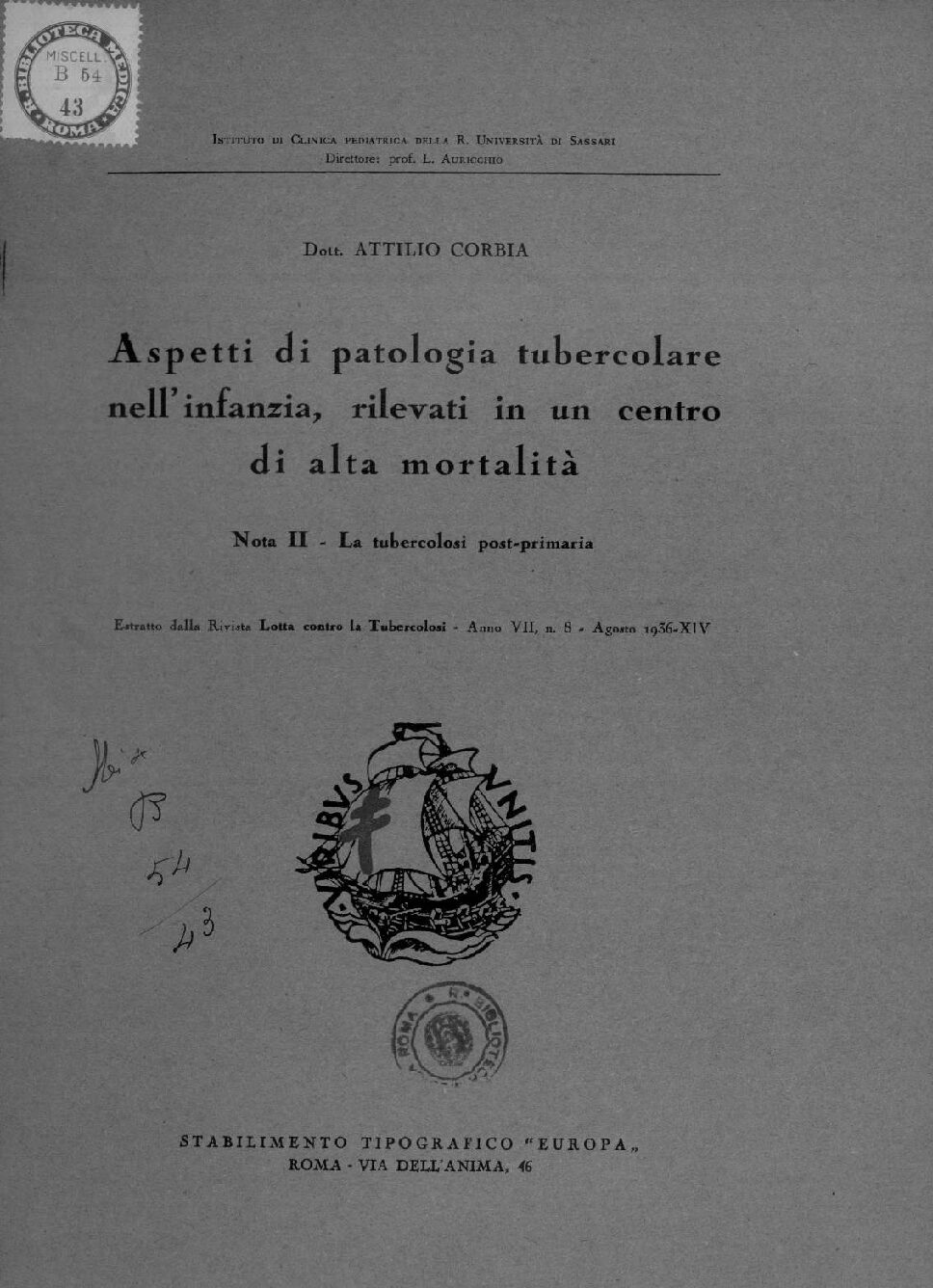 Estratto dalla Rivista Lotta contro la Tubercolosi,, – Anno VII, n. 8 Agosto 1936-XIV