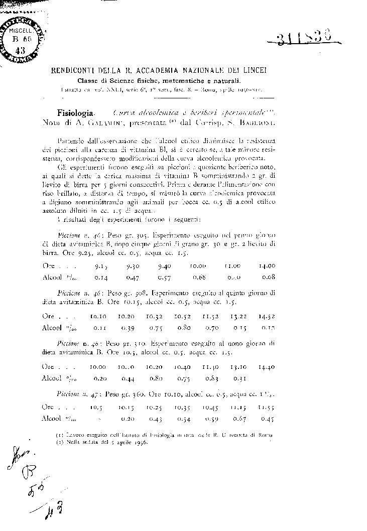 Fisiologia. – Curva alcoolemica e beriberi sperimentale(1).