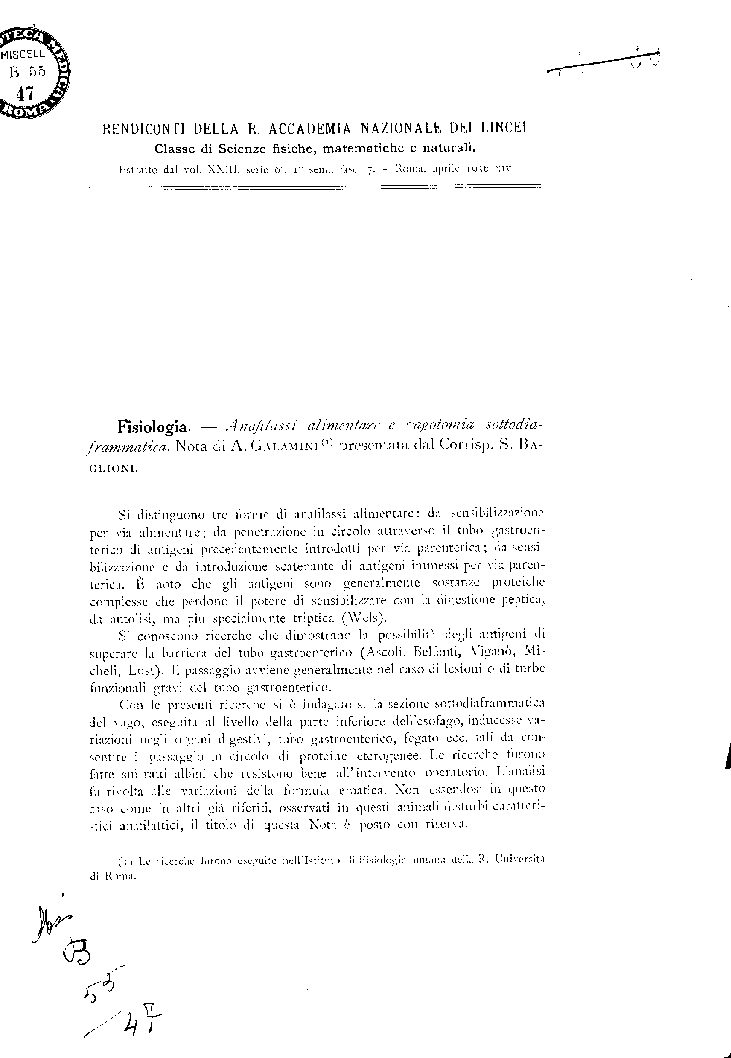 Fisiologia. – Anafilassi alimentare e vagotomia sottodia-