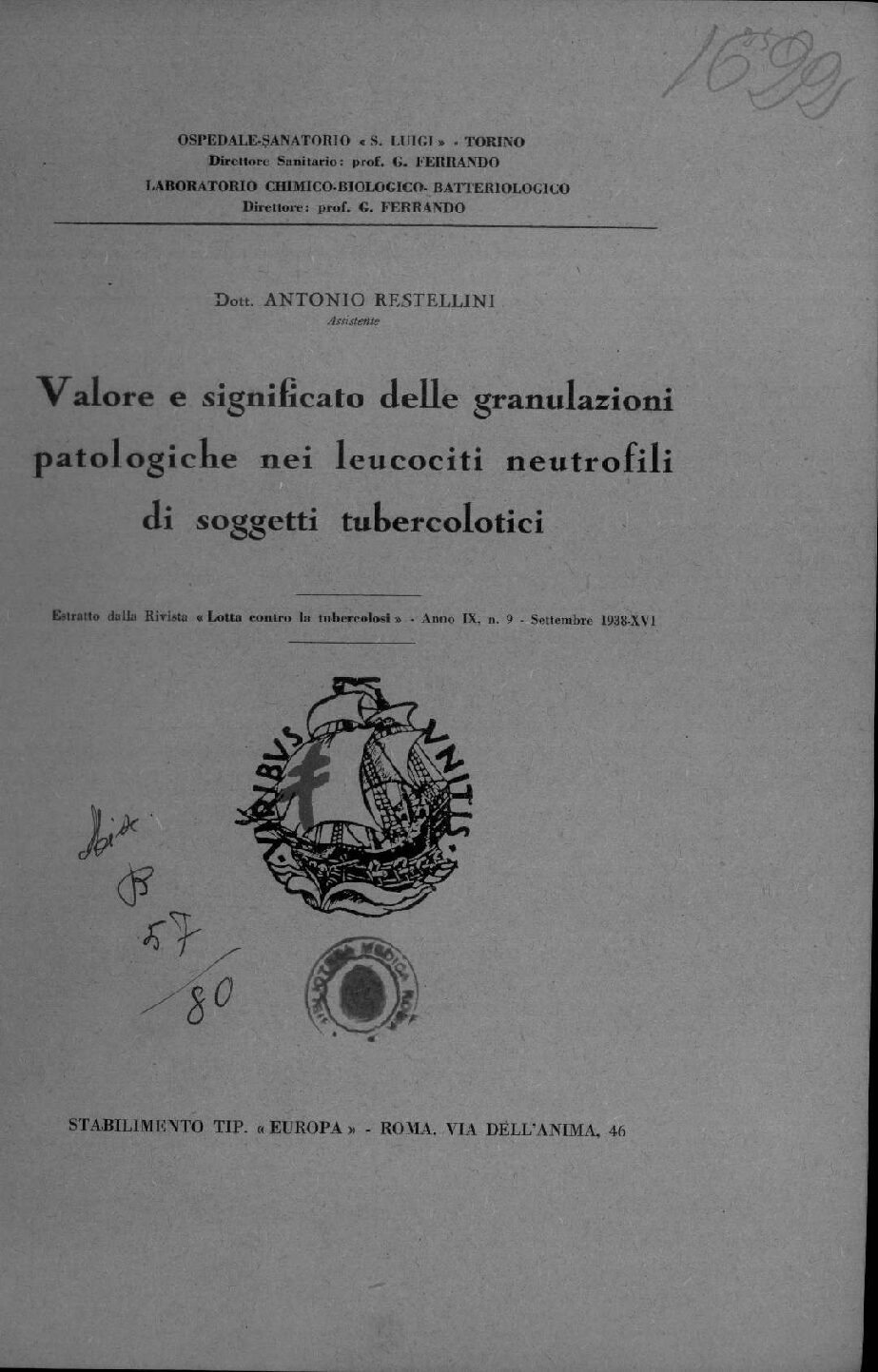 Estratto dalla Rivista Lotta contro la tubercolosi -Anno IX, n. 9-Settembe 1938-XVI