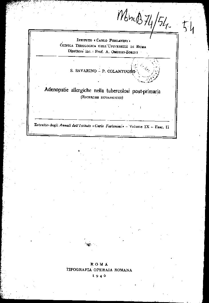 Estrattto dagli Annali dell’Istituto ” Carlo Forlanini ” – Volume IX – Fasc. II