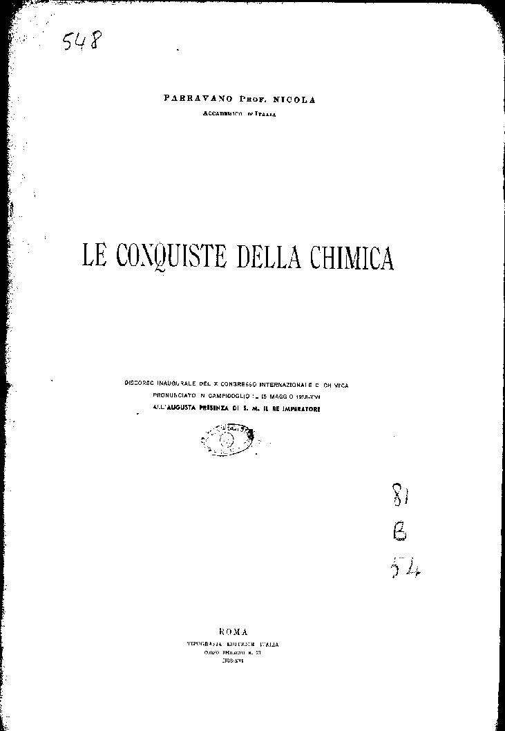 DISCORSO INAUGURALE DEL X CONGRESSO INTERNAZIONALE DI CHIMICA
