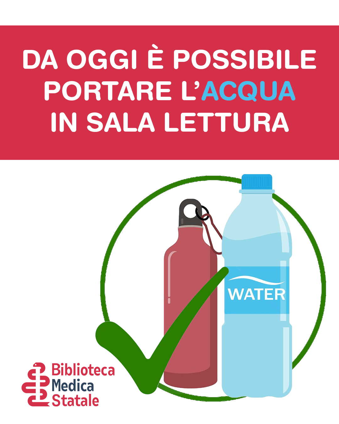 Da oggi è possibile portare con sé in Sala lettura bottiglie e borracce contenti acqua. Dovranno però essere tenute a terra, vicino alla propria postazione, in posizione stabile e non d’intralcio per l’utenza.